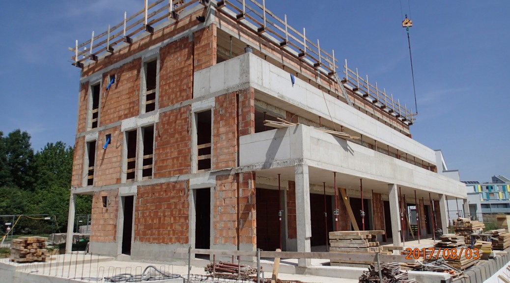 Die Arbeiten gehen zügig und termingerecht voran. Nach einer urlaubsbedingten Pause gehen am 21.08.2017 die Arbeiten wieder weiter. Die Stemmarbeiten sind großteils abgeschlossen und es kann die Rohinstallation mit vollem Einsatz weitergeführt werden. Ebenso finden parallel dazu die Dacharbeiten statt. Bis zur Gleichenfeier am 14. September sollen auch alle Rohbauarbeiten im Bereich der Tiefgarage abgeschlossen sein.
